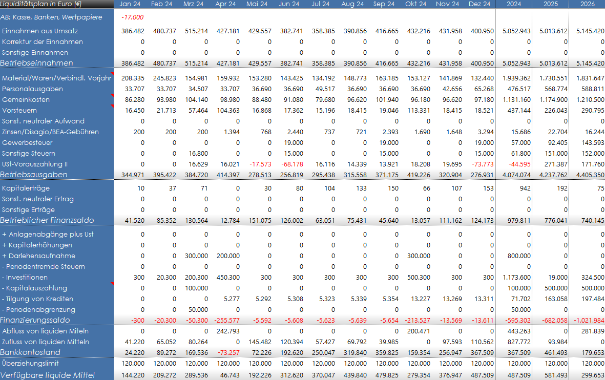 Mit einem anerkannten Planungssystem sind Sie in kurzer Zeit und ohne nachzudenken in der Lage, einen wirklich professionellen Liquiditätsplan zu erstellen, der jeder Prüfung standhält und der bei der Kreditvergabe durch Banken bzw. der Übernahme von Beteiligungen eine tragende Rolle spielt.